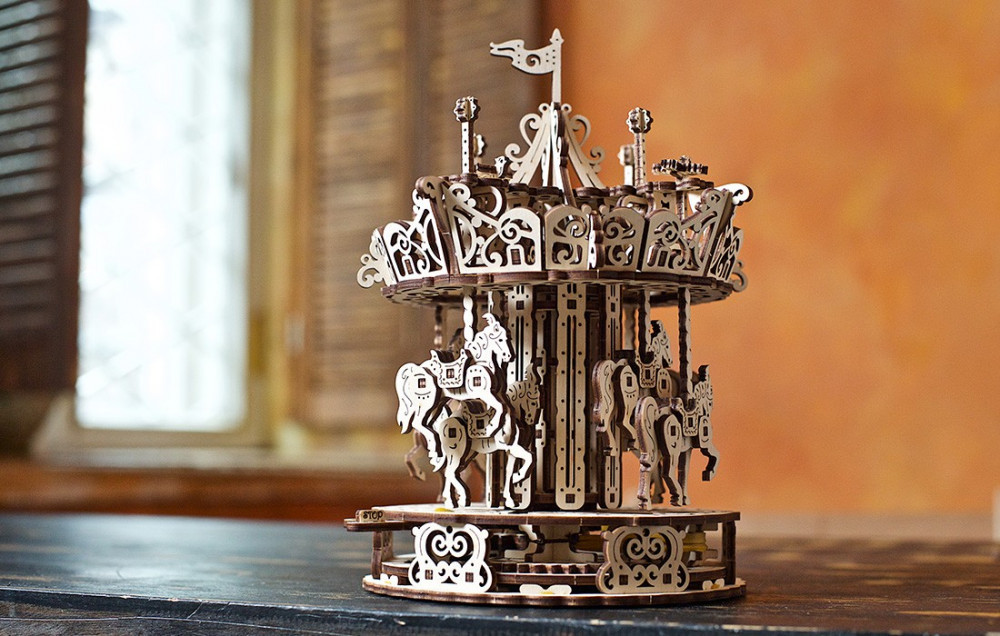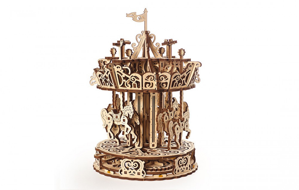 Ez a kiemelkedő modell egy Ugears-nézet a csúcsminőségű faanyagban megvalósított klasszikus körhintáról, a megszokott és szeretett vásártér nagyon részletes tervezéssel rendelkezik. Itt található kétféle körhinta ló, amelyek fel-le ringatnak, miközben a modell forog. A modell magja egy középső pólus, amely a fő peronnal ellentétes irányban forog, így úgy tűnik, mintha a körhinta gyorsabban forogna, mint valójában, és megteremtené az egész konstrukció lenyűgöző dinamikáját. A pólus a tető fölé emelkedik, így vizuálisan finomabbá válik, ugyanakkor nagyobb térfogattal rendelkezik. Add hozzá a körhinta tetején szárnyaló kis madarakat dekoratív repülő lámpákkal együtt, és csak érzékelheted a virsli és a vattacukor aromáját!