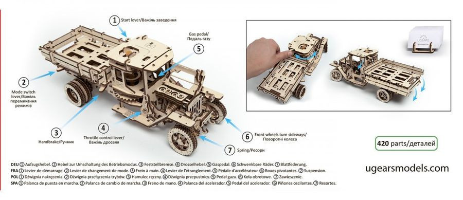 A Ugears termékek megtestesítik a természet egy darabkáját a szobában. A különleges, fa lemezekből álló játék önmagába véve kettős szerepet tölt be: először is izgalmas a megépítése, más részről kifinomult és letisztult, természetes dekorációs eleme a szobának, irodának vagy munkaállomásnak. A modellekben az elemek ragasztás nélkül összeilleszthetők, tervezésüknek köszönhetően tartós és időtálló darabok. Az összes modell mozgatható, vagyis valamilyen funkció végezhető vele (pl. a járművek fakerekeiken guríthatók, a dobozok nyithatók-zárhatók, más modellek tekerhetők, és a lendülettől mozognak). A Ugears famodellek természetes fából készülnek, natúr színük minden típusú polcok vagy asztalon jól mutat. A modellek fejlesztik a logikus gondolkodás, a finommotorikát és a kézügyességet, a szem-kéz koordinációt, és a térlátást. A különleges fa anyagnak köszönhetően az érzékelés-tapintás is fejlődik a játékkal, valamint segít a szabálykövetés elsajátításában (a megépítéshez útmutatót kell használni) és a mechanika alapjainak megértésében. Bártan ajánljuk Mindenkinek, aki szereti a modellezést, a kreatív és igényes játékokat, a kihívásokat, és a bütykölést, kézügyességet igénylő elfoglaltságokat. Méret: 34*12*12 cm. A játék 420 darabos. Az összeszerelés becsült ideje: 10-12 óra.